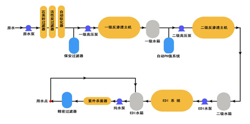 1、预处理系统→反渗透系统→中间水箱→粗混合床→精混合床→纯水箱→纯水泵→紫外线杀菌器→抛光混床→精密过滤器→用水对象 (≥18MΩ.CM)(传统工艺)