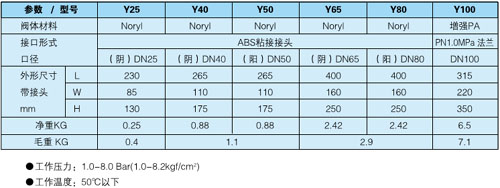 阀体及阀盖为玻纤加强 NORYL 材料,阀门强度高、使用寿命长、耐腐蚀;